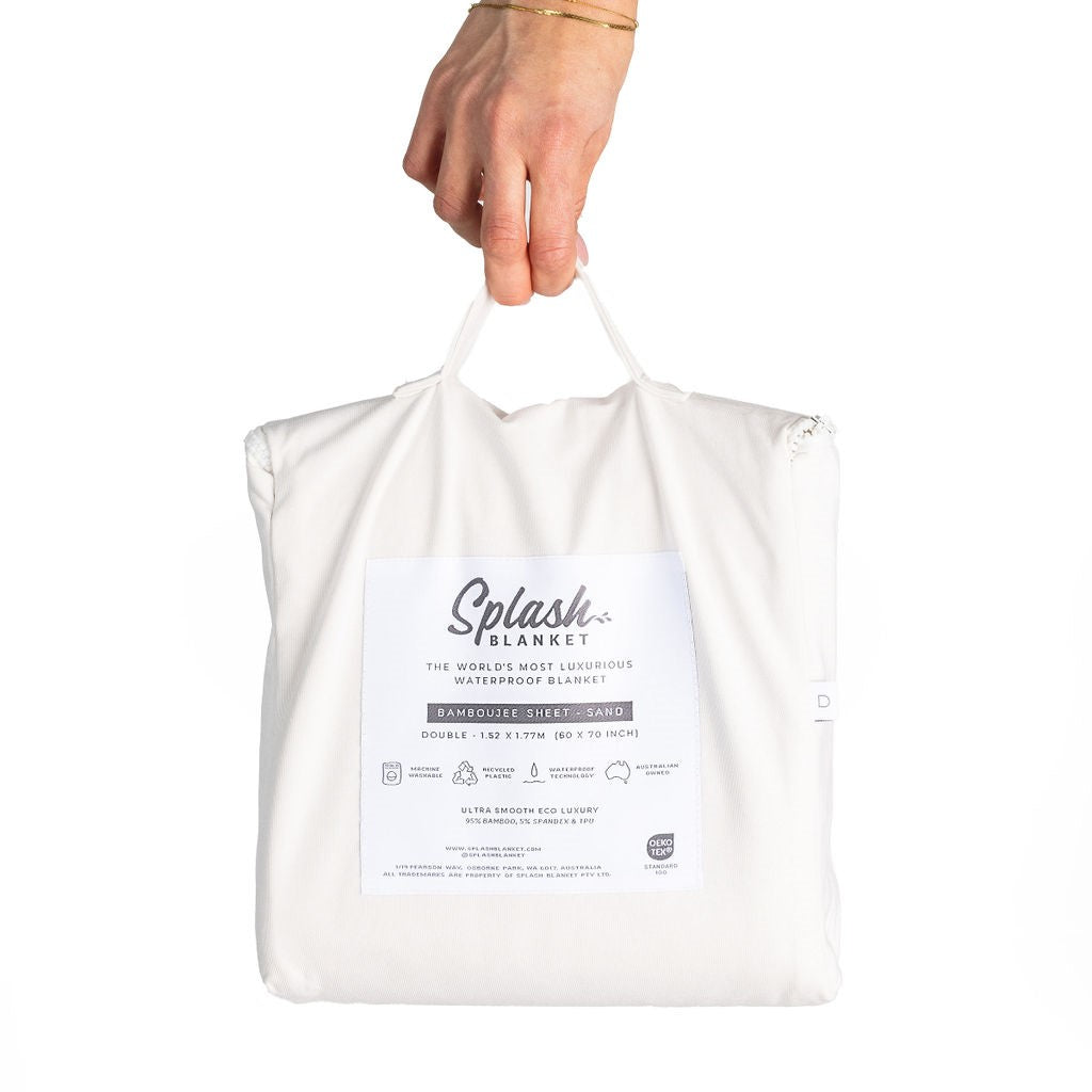 The Bamboujee Splash Blanket is made from 95% bamboo, making it the eco-friendly superhero of our Splash range. Fully waterproof and designed for ultimate luxury and practicality, it’s the perfect combination of comfort and sustainability - saving the planet, one spill at a time. Whether you're lounging on the couch or on the go, the Bamboujee blanket has you covered with a travel-size flat sheet and an all-rounder double-bed size, plus fitted sheets from cot size to super king. Cooling, comfortable, and guilt-free, what’s not to love?